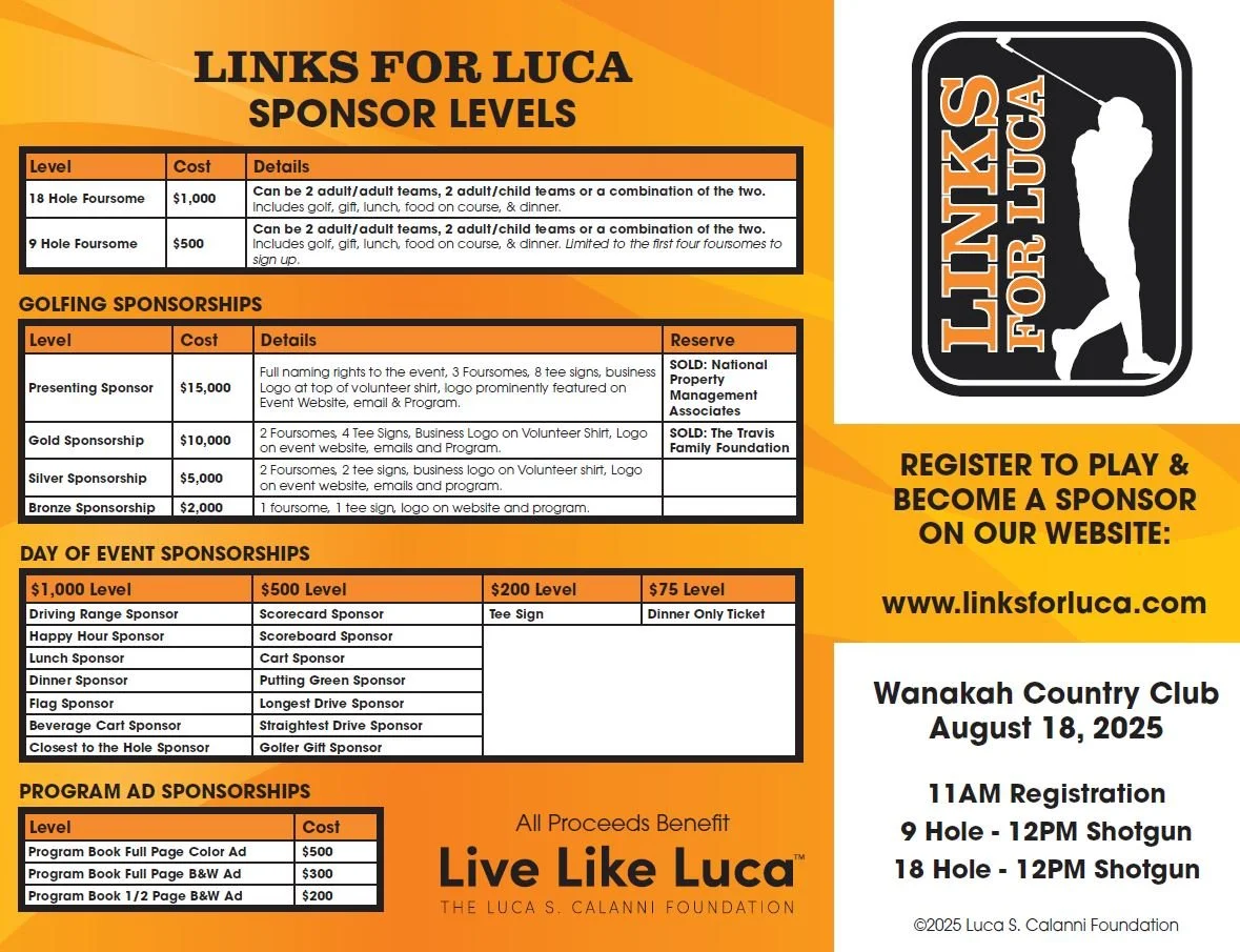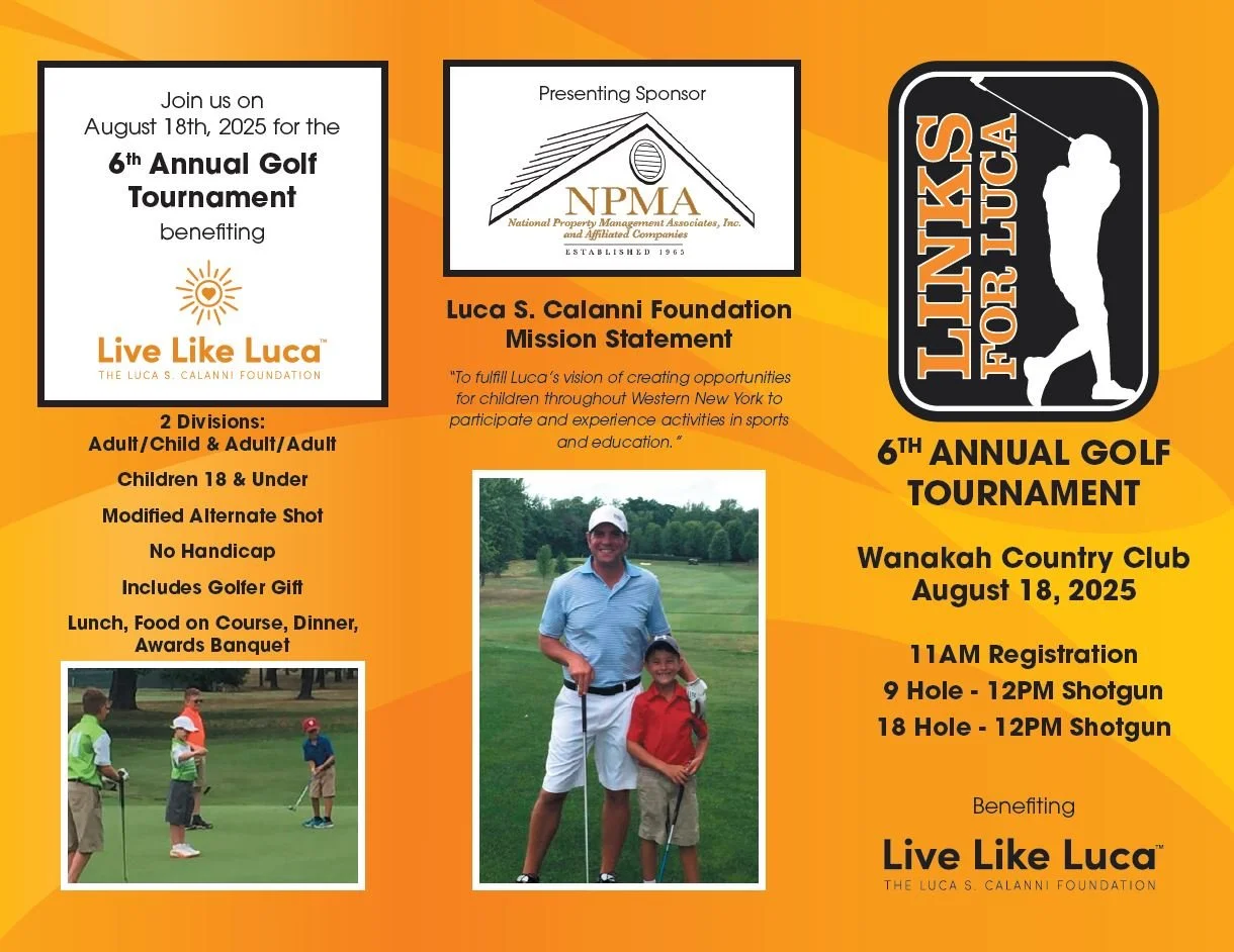 Please join us on August 18, 2025 for the 6th Annual Links for Luca Adult and Child Golf Tournament at Wanakah Country Club.
